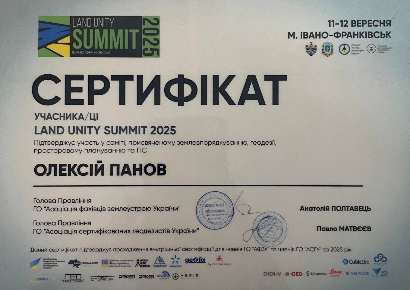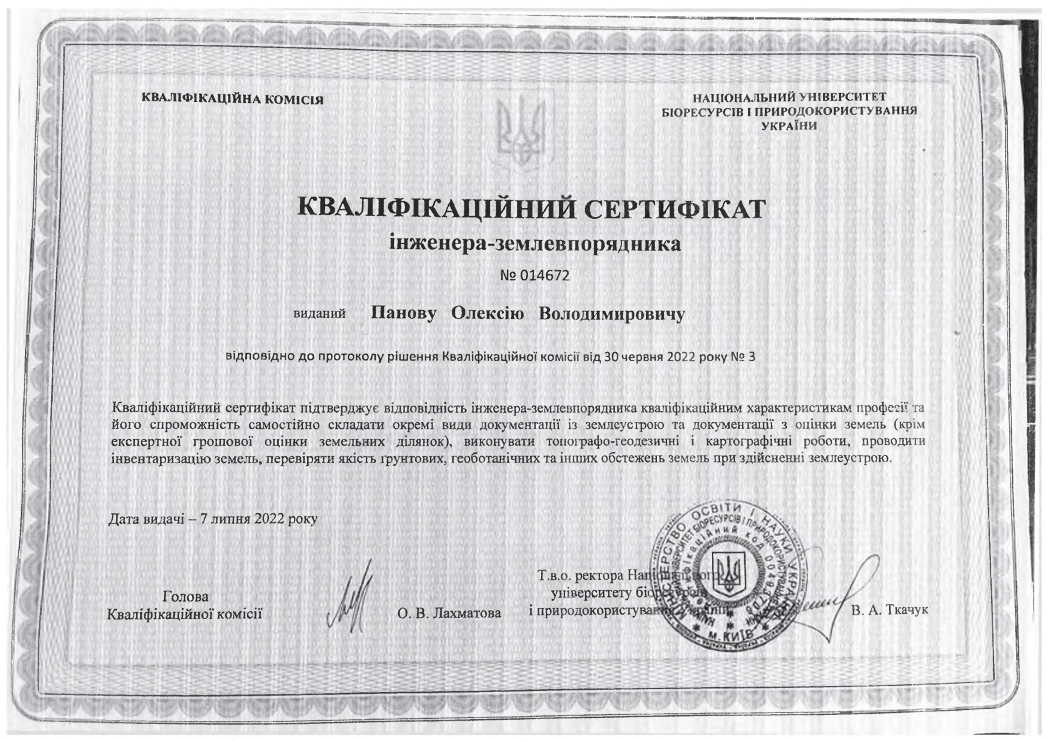 Сертифікат інженера-землевпорядника (№ 014672 від 07.07.2022 року). |